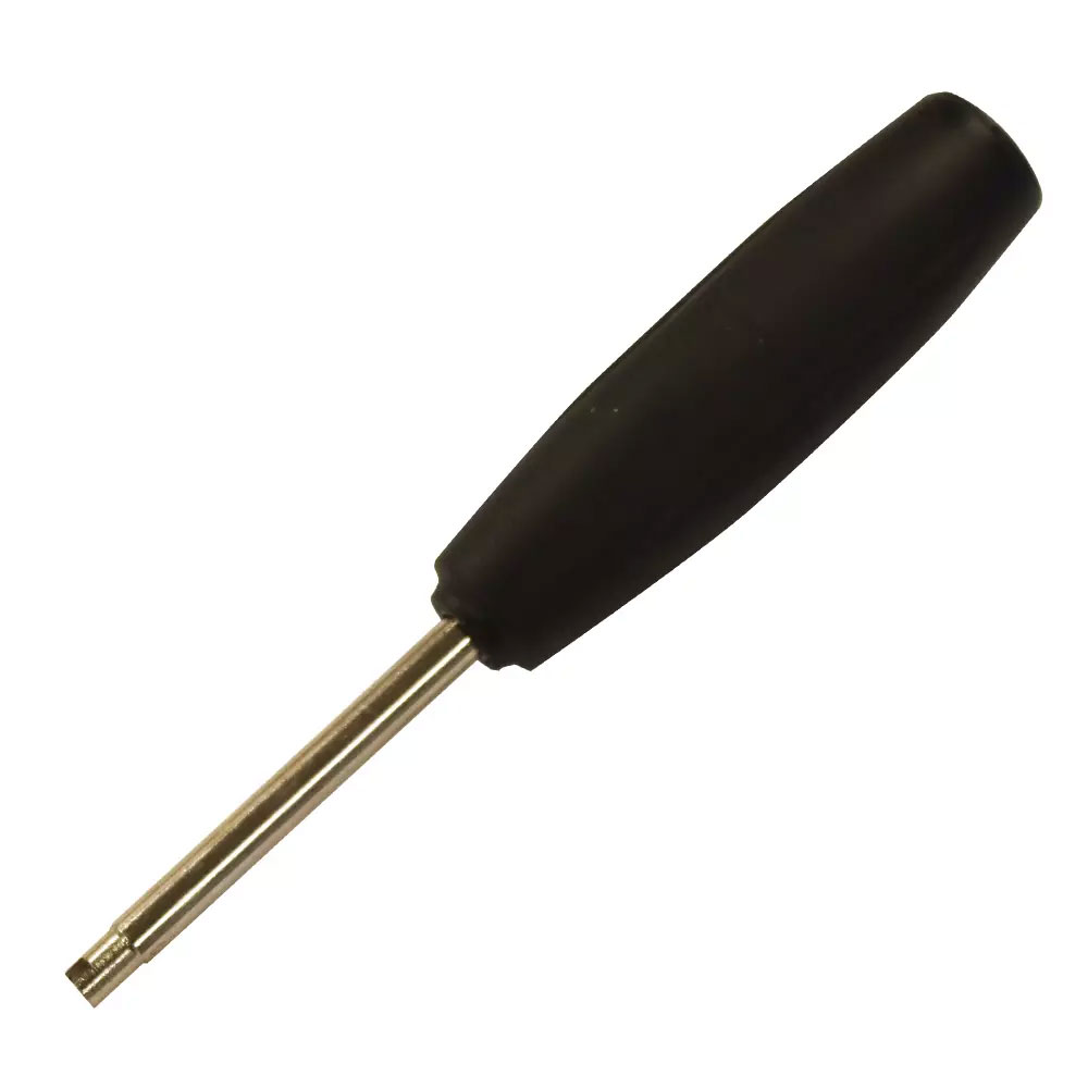Valve core torque wrench for Schrader valve cores. For removal and installation of the valve cores into the valve stems.